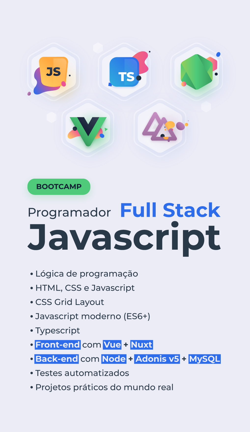 💻 Javascript | ECMAScript 6+ | Typescript | Vue | Atomic Design | Nuxt | Adonis | Introdução à Testes Automatizados | Testes E2E | Jest | Deploy de aplicações | CSS Grid Layout